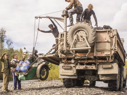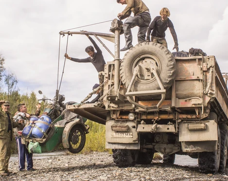 Alle Stassen enden hier. In der folgenden Winterpause entwickeln wir einen schwimmbaren Amphibien-Prototyp der Ural 650,denn im fernen Osten Russlands wartet der absolute Höhepunkt unserer Reise: 1600 km Fahrt auf dem entlegenen Kolyma Fluss. Aufgeregt stehen wir am Ufer des Kolyma und warten darauf, dass jemand kommt und uns aufhält… Es kommt aber niemand, und so bauen wir unsere Schiffswerft auf, lassen die Motorräder samt Schwimmkörper ins Wasser, tauschen Helme gegen Schwimmwesten und legen ab.
