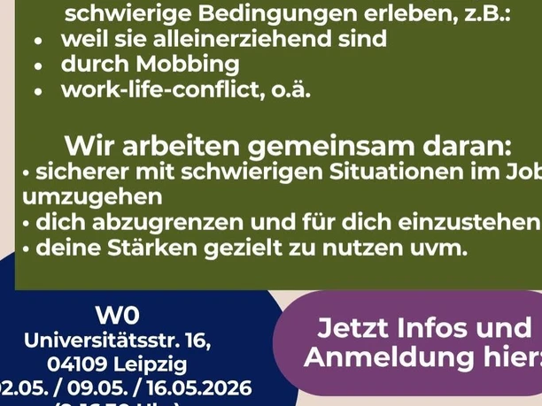 Im Workshop setzen sich Teilnehmerinnen mit Erfahrungen von Ungleichbehandlung im Job auseinander und entwickeln konkrete Strategien für einen selbstbewussteren Umgang im beruflichen Alltag. Im Fokus stehen unter anderem das Erkennen und Einsetzen eigener Stärken, souveränes Handeln in herausfordernden Situationen sowie mehr Klarheit in beruflichen Entscheidungen. Der Workshop kombiniert Reflexion, Austausch und praktische Übungen zur direkten Anwendung im Arbeitskontext.