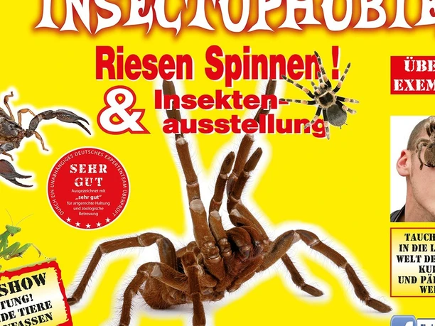 Lebende Riesen-Spinnen- und Insekten-Ausstellung – mit dabei die größte lebende Vogelspinne der Welt . Die Ausstellung richtet sich an Jung und Alt und lädt ein, die faszinierende Welt der Gliederfüßer hautnah zu erleben.