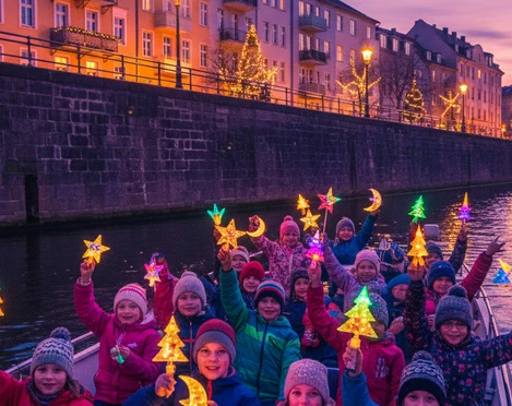 Es ist kurz vor Sonnenuntergang. Unser festlich erleuchtetes Boot wartet schon auf euch im Hafen. Strahlende Kinderaugen kommen dazu, als jedes Kind einen eigenen Lampion in die Hand bekommt. Wer will, kommt natürlich im Halloween-Kostüm. Mit dieser fröhlichen Mischung aus hell, dunkel und bunt starten wir in die Abenddämmerung auf Leipzigs Kanälen.