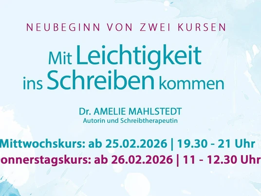Kursleitung: Dr. phil. AMELIE MAHLSTEDT, geb. 1976, Sprachwissenschaftlerin, freie Autorin und zertifizierte Leiterin für Schreibwerkstätten, Kreatives Schreiben und Biographie-Arbeit (EAG-FPI) | Anmeldung bitte bis zum 20.02.2026.