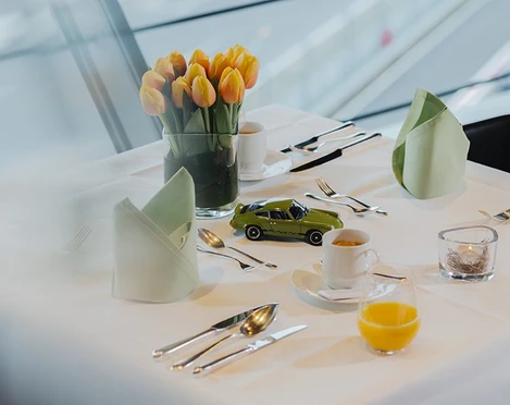 Im exklusiven Ambiente des Porsche Experience Center Leipzig erwarten wir Sie an einem kompletten Frühstücksbuffet z. B. mit Croissants und Gebäckvariationen inkl. diverser Konfitüren und einer reichhaltigen Antipasti- und Salatauswahl. Wir verwöhnen Sie der Jahreszeit angepasst z. B. mit gegrillter Rinderlende mit Sauce béarnaise oder geschmorter Hirschkeule mit Pfefferkirschen, dazu Kartoffelgratin, Rosmarinkartoffeln oder Haselnuss-Spätzle mit einer Auswahl an Gemüse u.v.m. Unser Dessertbuffet lockt beispielsweise mit leichter Orangencreme, Chili Cognac Mousse mit Cassissauce und Eiscreme, einem Schokobrunnen und einer internationalen Käseauswahl. Bitte beachten Sie, dass das Angebot je nach Tageskarte variiert. Kaffee, Tee, heiße Schokolade, Mineralwasser und eine Auswahl an Säften sind inklusive.