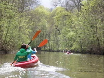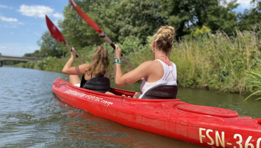 2er Kajak ausleihen, Paddeln zum Cospudener See und Rücktransport von uns - 11 Stunden
