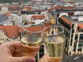 Zum Abschluss genießen Sie bei einem Glas alkoholfreien Sekt auf der Aussichtsplattform nicht nur die fantastische Weitsicht, sondern auch einen stillen Moment über den Dächern Leipzigs.