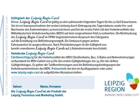 Wichtiger Hinweis zur Buchung: Wir senden Ihnen die LEIPZIG REGIO CARD innerhalb einer Woche zu und Sie entscheiden, wann sie die LEIPZIG REGIO CARD zum ersten Mal benutzen und die Gültigkeit beginnt. Bitte klicken Sie bei der Bestellung dennoch irgend einen Termin in der Zukunft an. Dieser muss aus technischen Gründen gewählt werden und hat nichts mit der Gültigkeit der LEIPZIG REGIO CARD zu tun. Bei einer im laufenden Jahr erworbenen LEIPZIG REGIO CARD ist die Gültigkeit nach Preisänderungen (i.d.R. ab Januar) auf 3 Kalendermonate beschränkt.