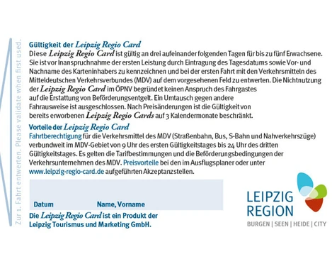 Mit der LEIPIZG REGIO CARD 3-Tageskarte genießen Sie freie Fahrt auf allen Straßenbahn-, Bus-, S-Bahn-Linien und Nahverkehrszüge (RE, RB, MRB) im Gesamtnetz des Mitteldeutschen Verkehrsverbundes (MDV).