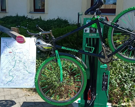 Mit Luftpumpe und verschiedenen Werkzeugen ausgestatten, ist die Station ein toller Helfer auf der nächsten Radreise.