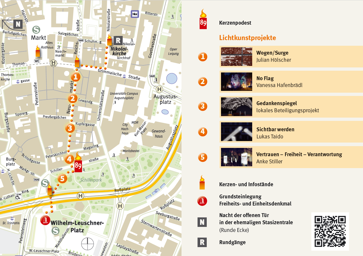 Kerzen sind beim Lichtfest Leipzig elementarer Bestandteil des Erinnerns an die Friedliche Revolution im Herbst 89. In diesem Jahr steht das große Kerzenpodest – die Kerzen-89 – im Schillerpark und wartet darauf, von den Lichtfestgästen mit Kerzen befüllt zu werden. Kerzen gibt’s kostenlos oder gegen eine freiwillige Spende an den Kerzenständen in der Innenstadt. In diesem Jahr kommen die Spenden aus der Aktion Kerzenpaten dem soziokulturellen Zentrum „Die VILLA“ zugute.