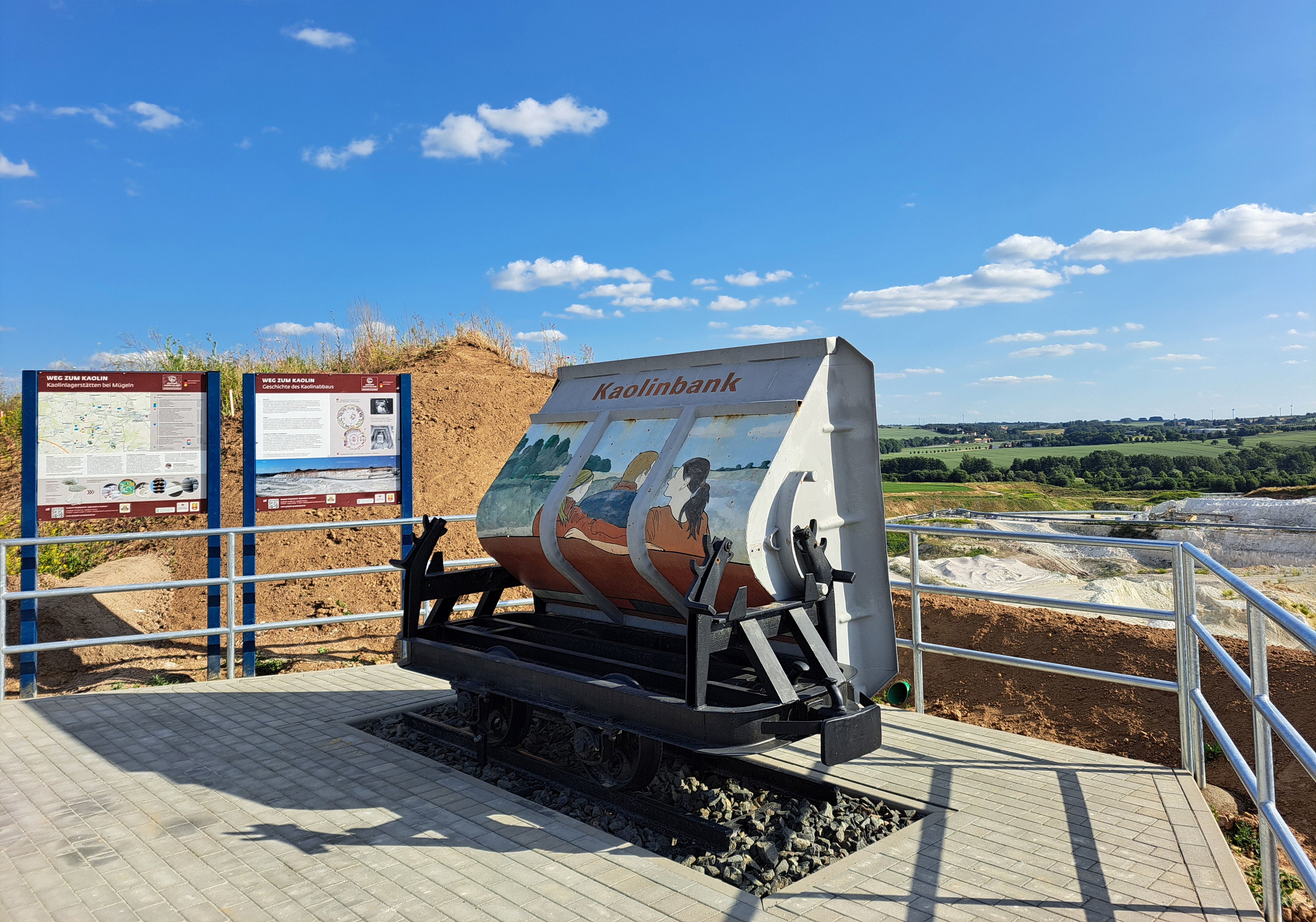 In Folge der Verlegung des Abbaubereiches im Kaolin-Tagebau Schleben/Crellenhain in Mügeln, errichteten die Kemmlitzer Kaolinwerke im Juni 2025 zwei neue Aussichtsplattformen, von denen Besucher einen optimalen Blick auf das aktuelle Abbaugeschehen haben. Der Informationspunkt mit den beiden Geopark-Informationstafeln und der Kaolin-Bank wurde an die Nordostseite des Tagebaus verlegt. Hier teilt die neu angelegte Betriebsstraße den Kaolin-Tagebau in ein aktuelles und künftiges Abbaufeld. Die GeoRoute "Weg zum Kaolin" führt jetzt um das gesamte aktuelle Abbaufeld herum. Von der Aussichtsplattform auf der Westseite aus fällt der Blick auf die Tunnelröhren, die beide Abbaufelder verbinden. Die Attraktivität des Rundwegs geht dabei weit über das "weiße Gold", wie der Kaolin wegen seiner Verwendung zur Porzellanherstellung auch bezeichnet wird, hinaus.