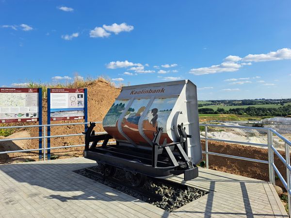Zwei neue Aussichtspunkte laden am Kaolin-Tagebau Schleben/Crellenhain zum Beobachten des Abbaugeschehens ein. Auch die Wegeführung rund um das Abbaufeld der weißen Porzellanerde ist neu. Beide Optimierungen haben die Stadt Mügeln und der Geopark in die GeoRoute "Weg zum Kaolin" aufgenommen.